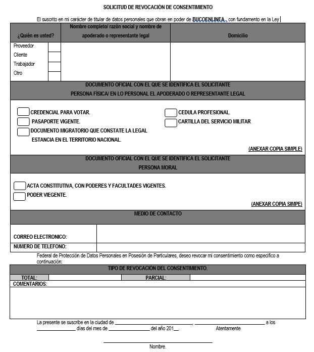 Usted tiene derecho de acceder, rectificar y cancelar sus datos personales, así́ como de oponerse al tratamiento de los mismos o revocar el consentimiento que para tal fin nos haya otorgado, para ello bastará que llene de manera correcta el formato de “Solicitud de Derechos Arco”, mismo que se encuentra en la página de internet de “BUCOENLINEA” en la siguiente LIGA (SOLICITUD DE REVOCACION DE CONSENTIMIENTO)la cuál deberá de ser enviada mediante correo electrónico al señalado previamente en el apartado II. Área responsable del manejo, resguardo y administración de datos personales con la leyenda de “SOLICITUD DERECHOS ARCO” en el apartado de asunto o presentada personalmente en las instalaciones de “BUCOENLINEA” ante el Departamento de Datos Personales.